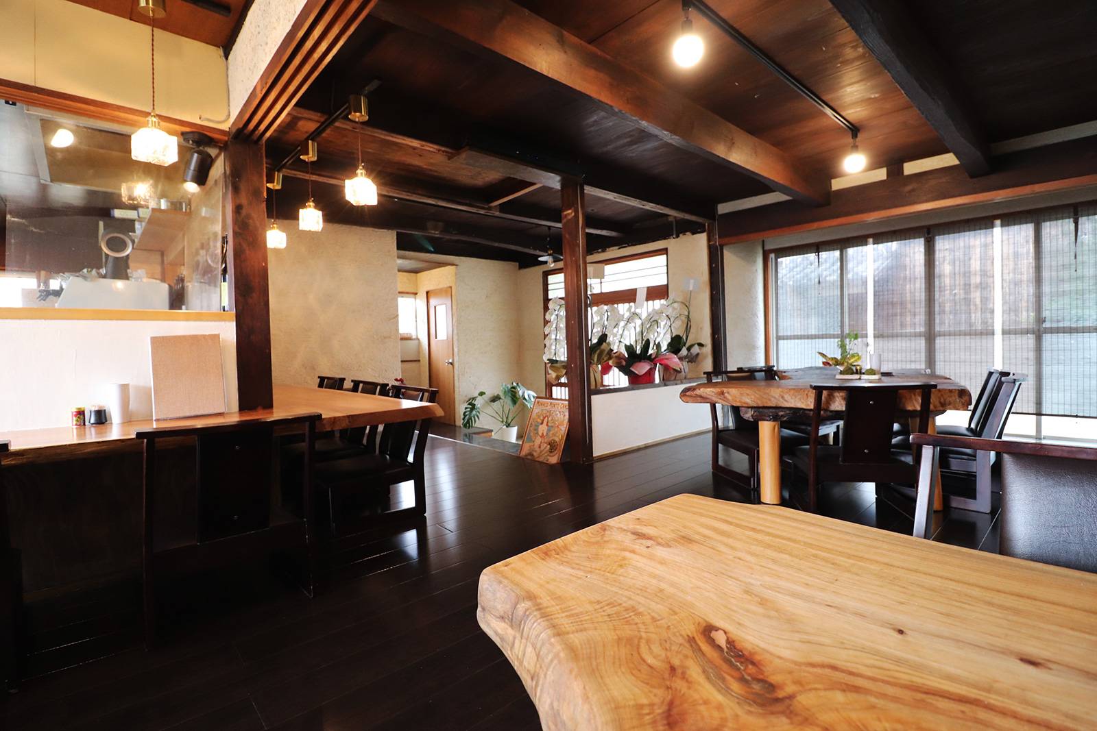こだわりの杉材を用いたカウンター、テーブル席をはじめとし、